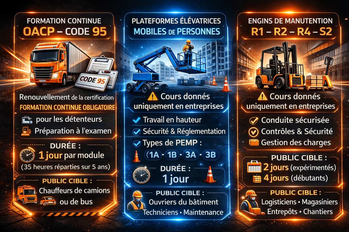 Vous souhaitez perfectionner votre conduite, obtenir une attestation de cariste ou d’opérateur PEMP, valider votre certificat OACP ou rester à jour avec les cours 95
